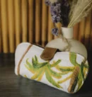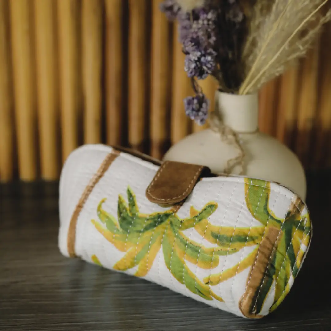 Embrace organic elegance with this beautifully quilted pouch, designed to showcase lush green and yellow tropical leaf patterns on a soft fabric base. The warm brown leather accents—strap and trim—add depth and sophistication, making it ideal for carrying travel essentials, small accessories, or makeup. Lightweight yet sturdy, it fits easily into a handbag or backpack, adding a splash of natural beauty to your daily routine. A perfect blend of artistry and practicality, this pouch suits both laid-back getaways and stylish desk-side organization.